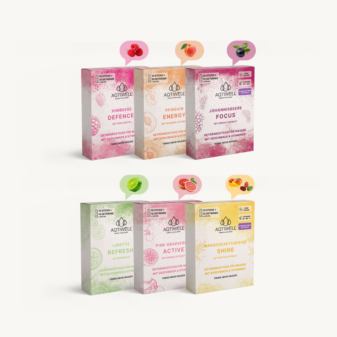 → 6 x 10 Aqtiwell Sticks (=60 Getränke)